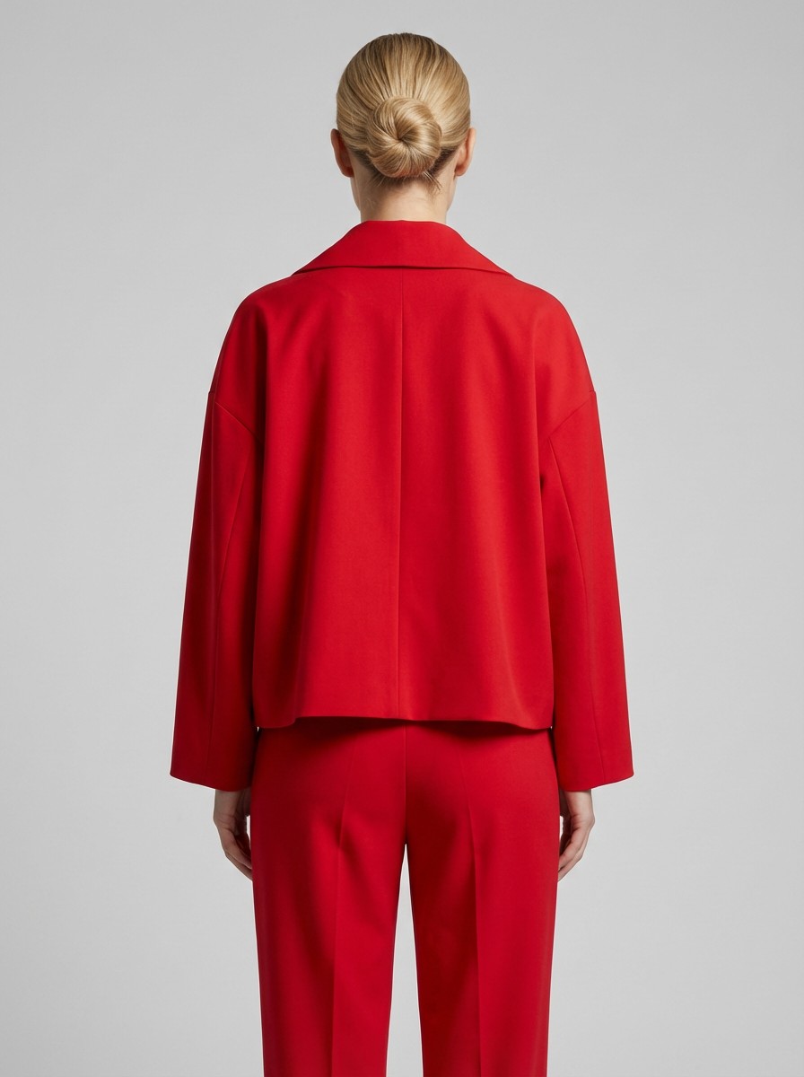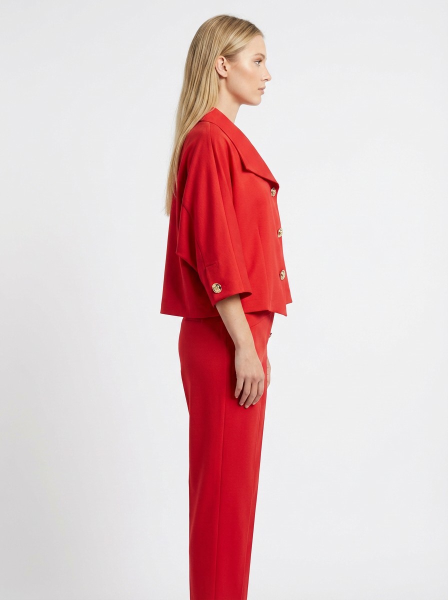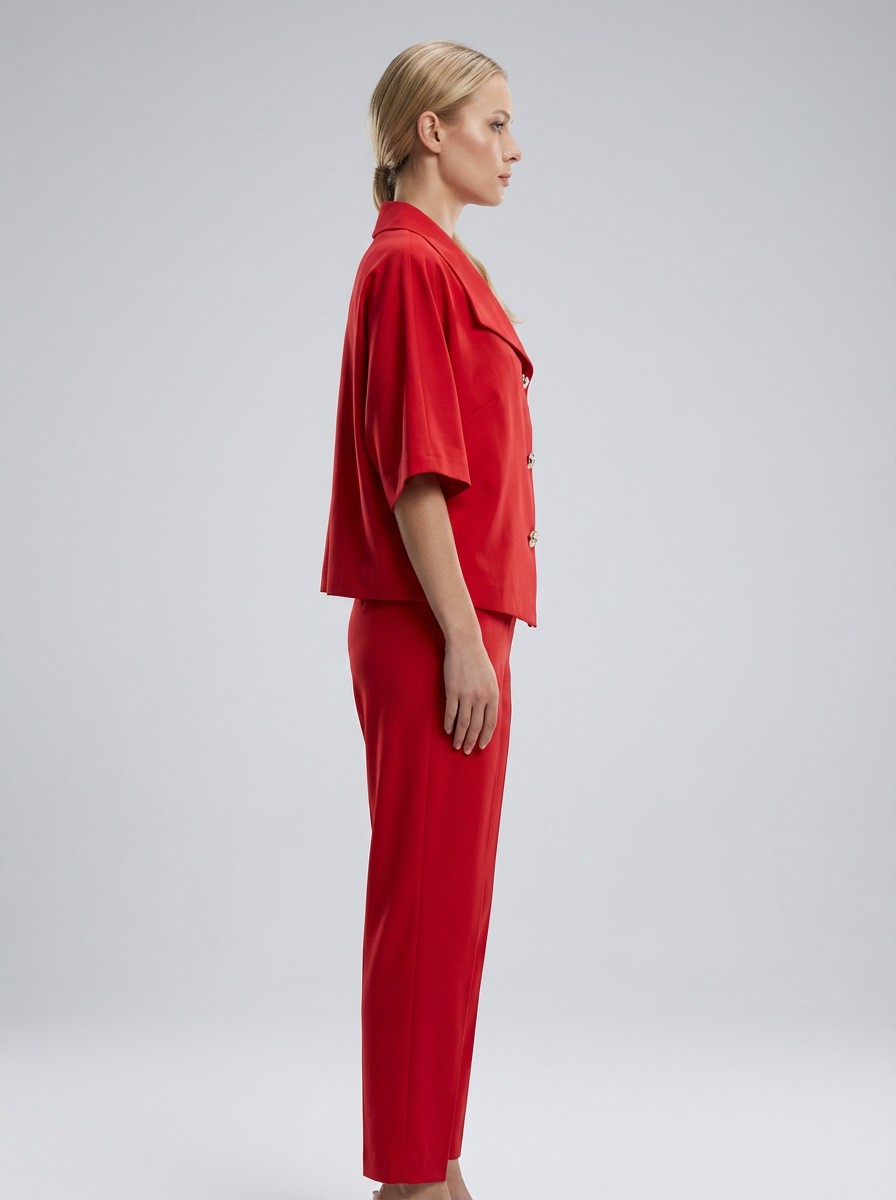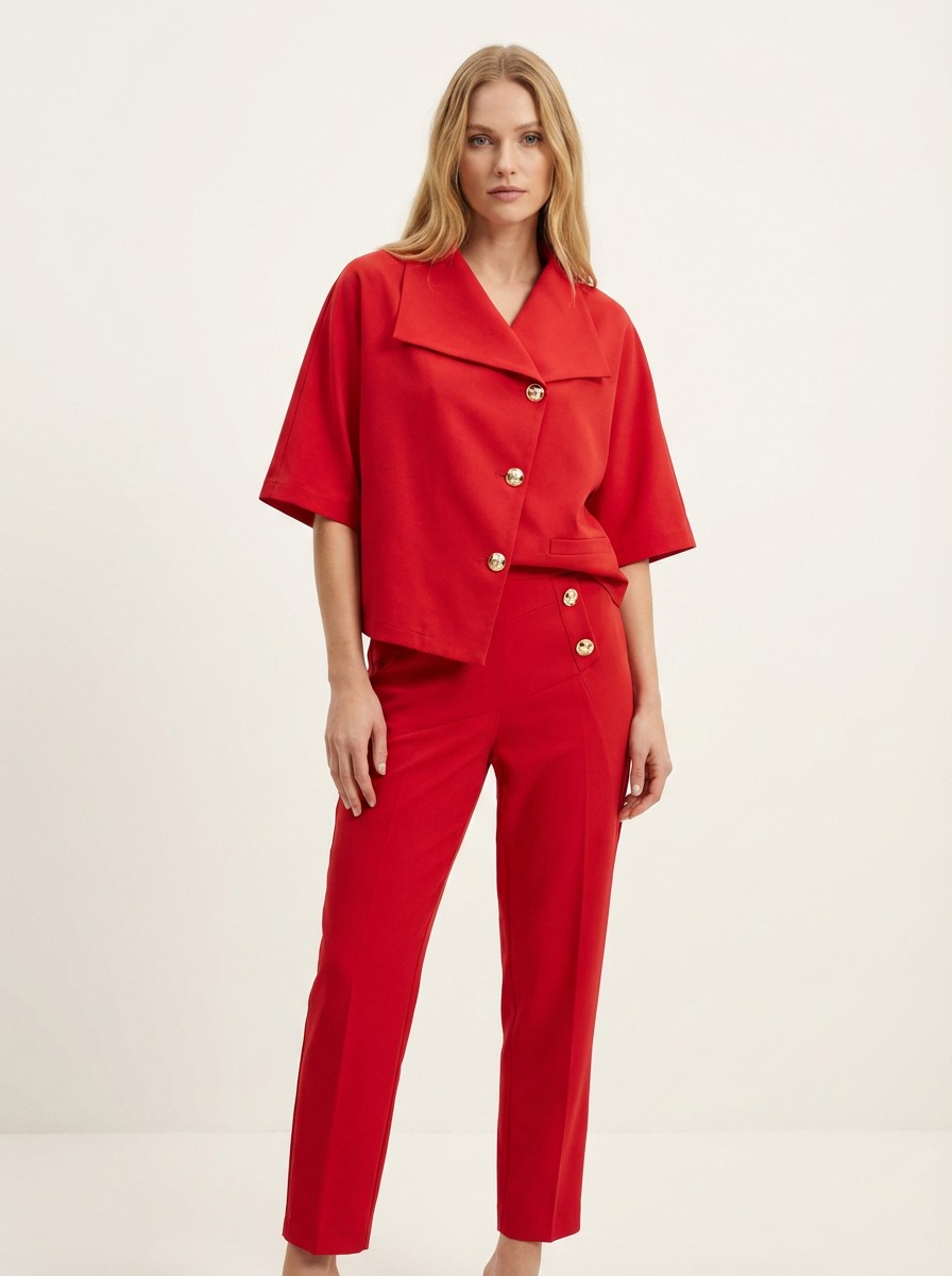 Κομψό και δυναμικό σετ σε έντονο κόκκινο χρώμα που αποπνέει αυτοπεποίθηση και στυλ. Αποτελείται από cropped σακάκι με εντυπωσιακά χρυσά κουμπιά και μοντέρνα γραμμή, καθώς και παντελόνι με ιδιαίτερο σχέδιο και διακριτικές πιέτες που κολακεύουν τη σιλουέτα. Ιδανική επιλογή για chic εμφανίσεις από το πρωί έως το βράδυ. Φοριέται εύκολα μαζί ή και ξεχωριστά για πολλαπλούς συνδυασμούς. Ένα statement κομμάτι που δεν πρέπει να λείπει από τη ντουλάπα σου.