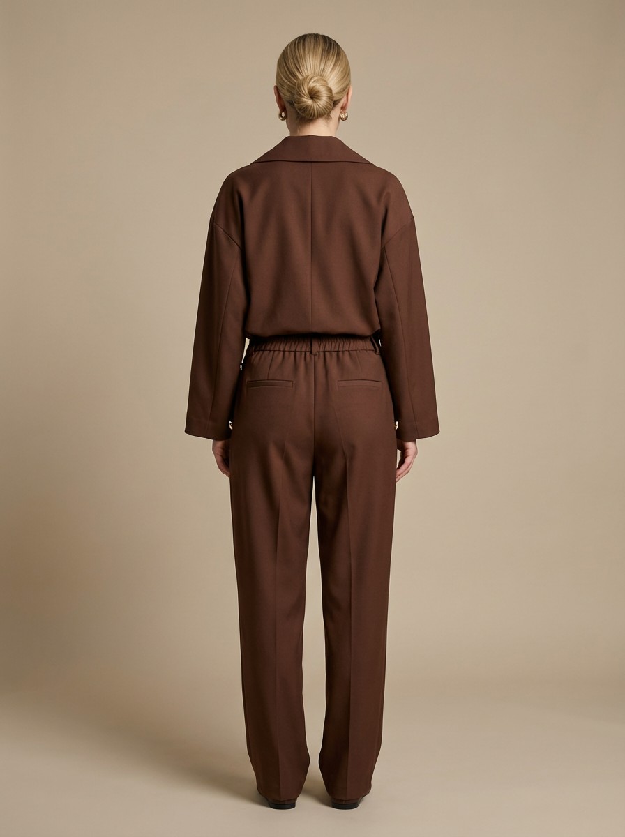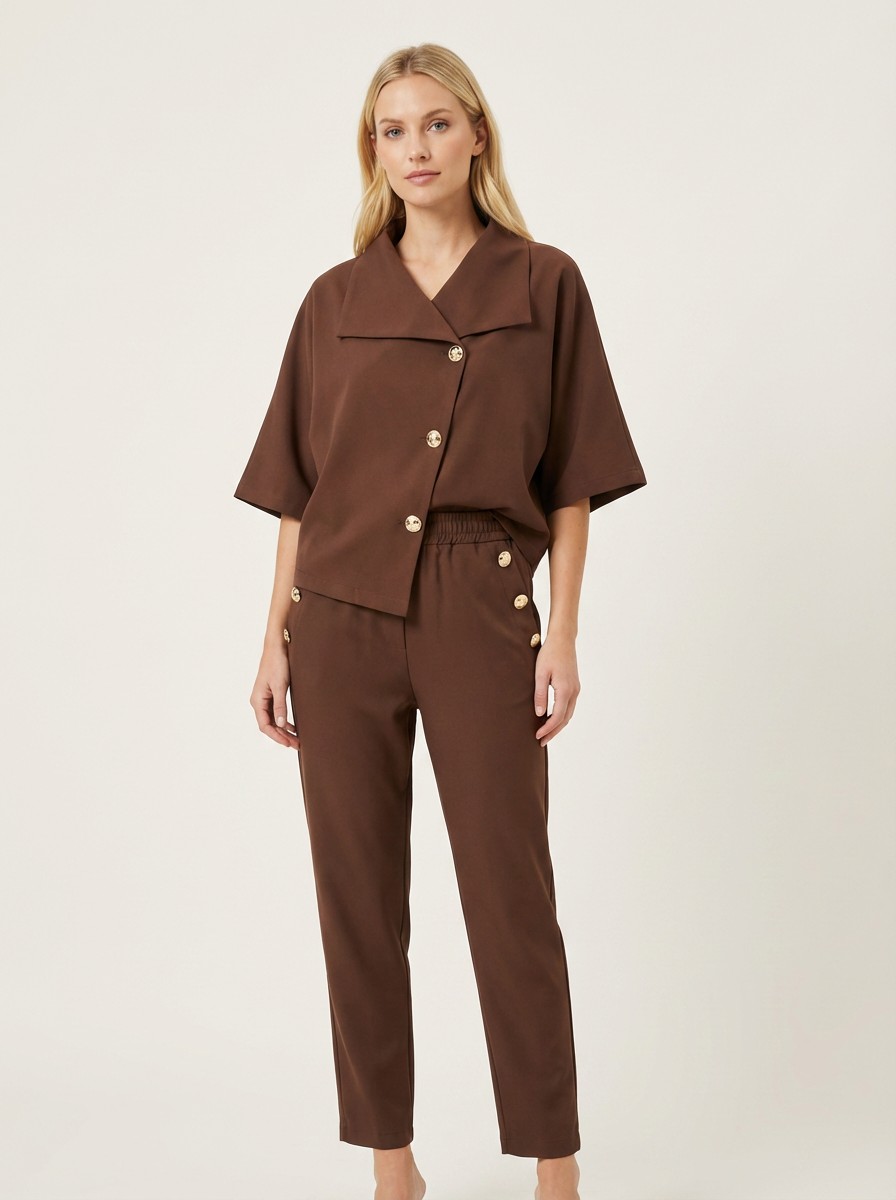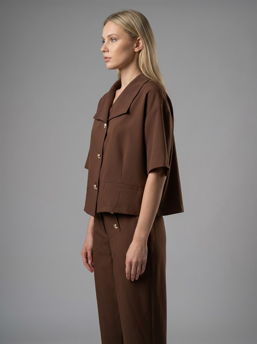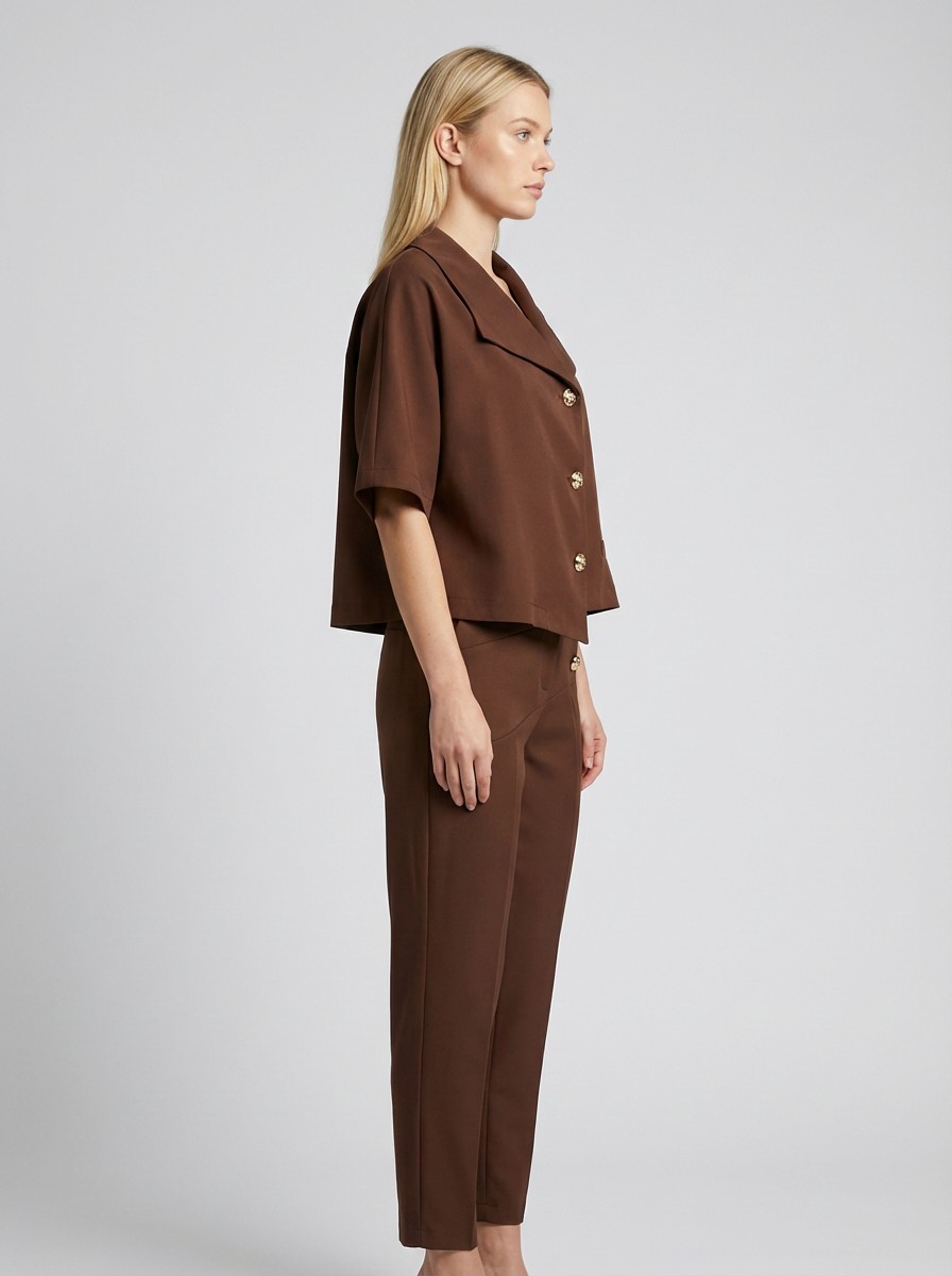 Κομψό και δυναμικό σετ σε σοκολα χρώμα που αποπνέει αυτοπεποίθηση και στυλ. Αποτελείται από cropped σακάκι με εντυπωσιακά χρυσά κουμπιά και μοντέρνα γραμμή, καθώς και παντελόνι με ιδιαίτερο σχέδιο και διακριτικές πιέτες που κολακεύουν τη σιλουέτα. Ιδανική επιλογή για chic εμφανίσεις από το πρωί έως το βράδυ. Φοριέται εύκολα μαζί ή και ξεχωριστά για πολλαπλούς συνδυασμούς. Ένα statement κομμάτι που δεν πρέπει να λείπει από τη ντουλάπα σου.