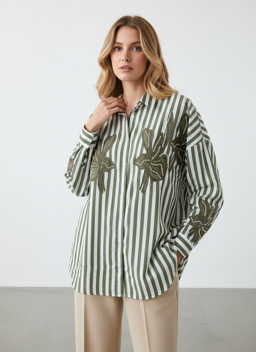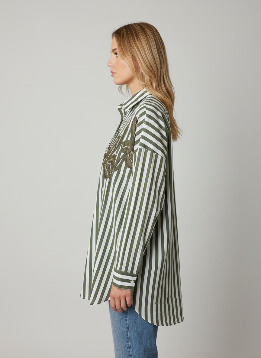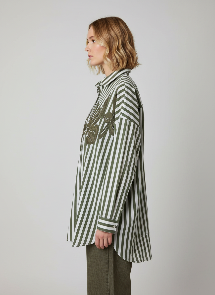 Ολη η ιταλική φινέτσα πάνω στο συγκεκριμένο πουκάμισο .Ακομα πιο ξεχωριστό το κάνει η ρίγα του και τα ιδιαίτερα κεντήματα του .Αποπνέει φρεσκάδα και θηλυκότητα.