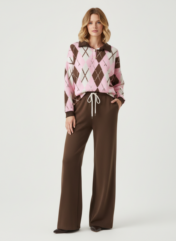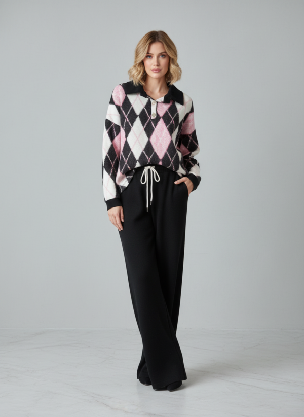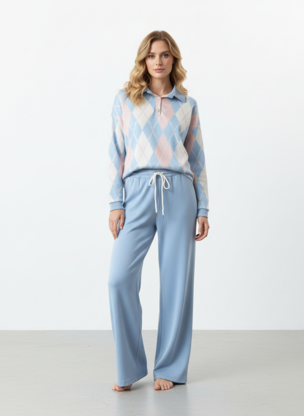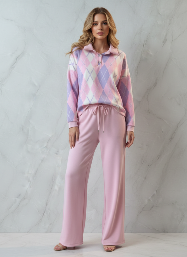 Ένα κομψό και άνετο σετ σε παστέλ αποχρώσεις που αποπνέει φρεσκάδα και στυλ. Αποτελείται από παντελόνα σε απαλό κίτρινο με λάστιχο και κορδόνι στη μέση για τέλεια εφαρμογή, και μπλούζα με γιακά και διακριτικά κουμπιά. Το ιδιαίτερο ρόμβο σχέδιο σε κίτρινο, γαλάζιο και λευκό χαρίζει μια μοντέρνα αλλά και διαχρονική αισθητική. Ιδανικό για καθημερινές εμφανίσεις με άνεση και στυλ από το πρωί έως το βράδυ. Συνδυάζεται εύκολα με sneakers ή πιο κομψά παπούτσια για διαφορετικά looks.