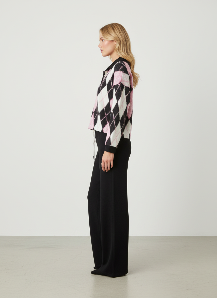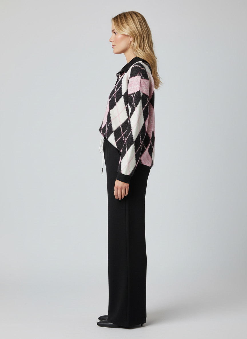 Ένα κομψό και άνετο σετ σε παστέλ αποχρώσεις που αποπνέει φρεσκάδα και στυλ. Αποτελείται από παντελόνα σε μαύρο χρώμα με λάστιχο και κορδόνι στη μέση για τέλεια εφαρμογή, και μπλούζα με γιακά και διακριτικά κουμπιά. Το ιδιαίτερο ρόμβο σχέδιο σε μαύρο ,ροζ και λευκό χαρίζει μια μοντέρνα αλλά και διαχρονική αισθητική. Ιδανικό για καθημερινές εμφανίσεις με άνεση και στυλ από το πρωί έως το βράδυ. Συνδυάζεται εύκολα με sneakers ή πιο κομψά παπούτσια για διαφορετικά looks.