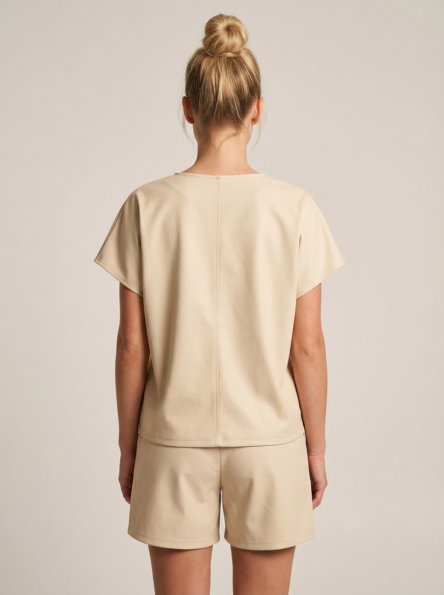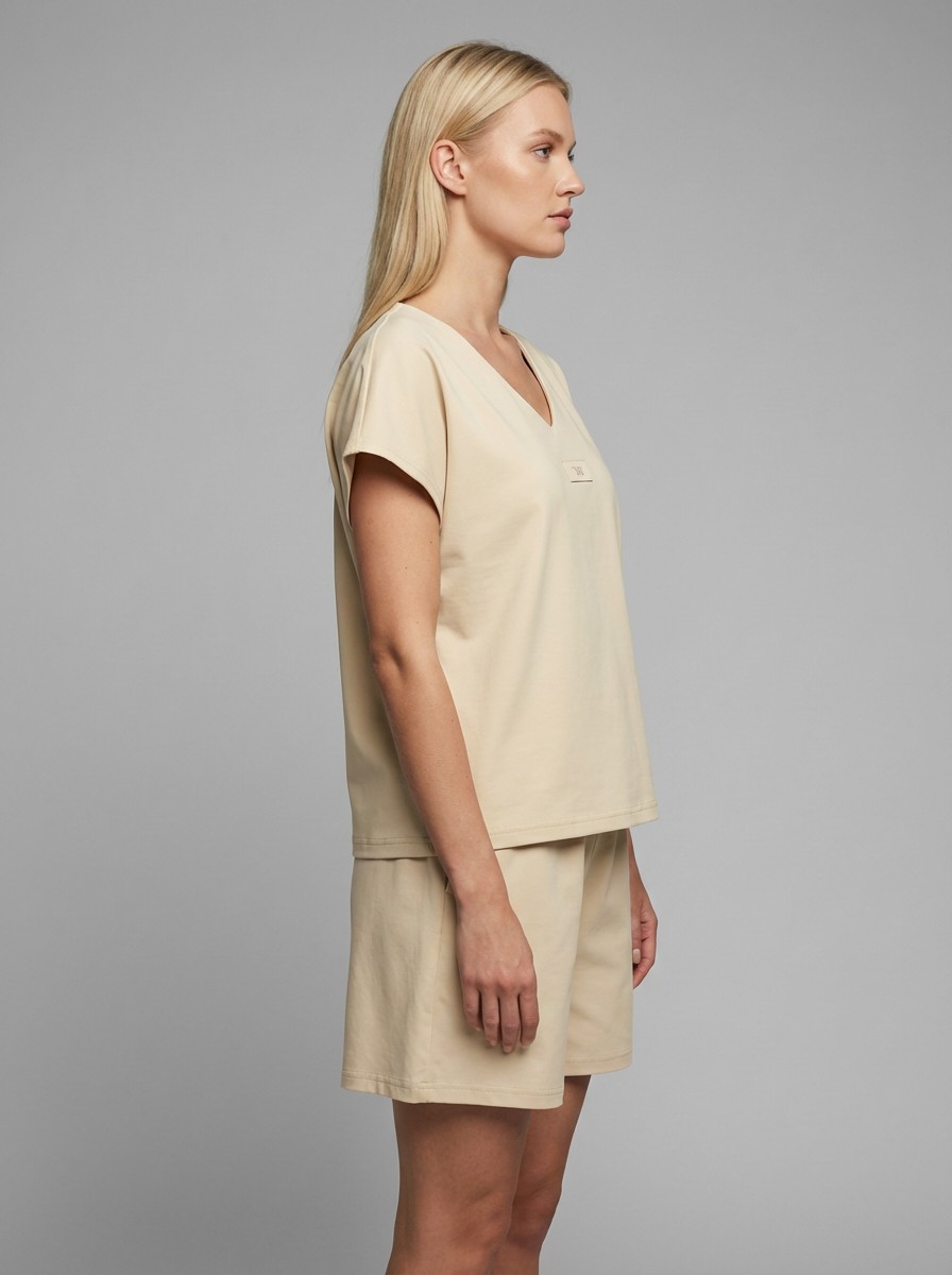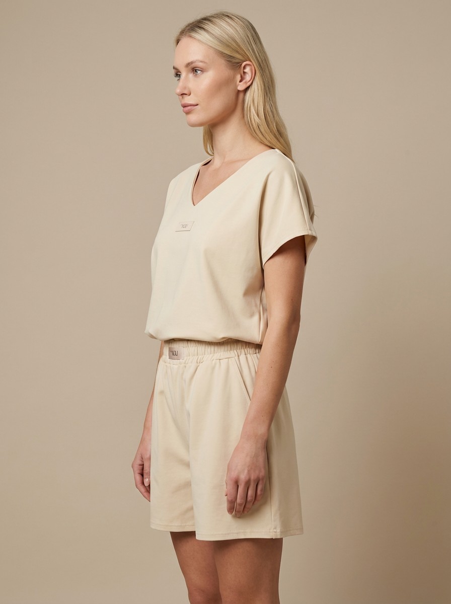 Ανάλαφρο και κομψό σετ σε υπέροχη μπεζ απόχρωση, ιδανικό για τις καθημερινές αλλά και πιο chic εμφανίσεις σου. Το T-shirt διαθέτει χαλαρή γραμμή με V λαιμόκοψη, προσφέροντας άνεση και στυλ, ενώ η βερμούδα με λάστιχο στη μέση αγκαλιάζει όμορφα το σώμα και χαρίζει ελευθερία κινήσεων.