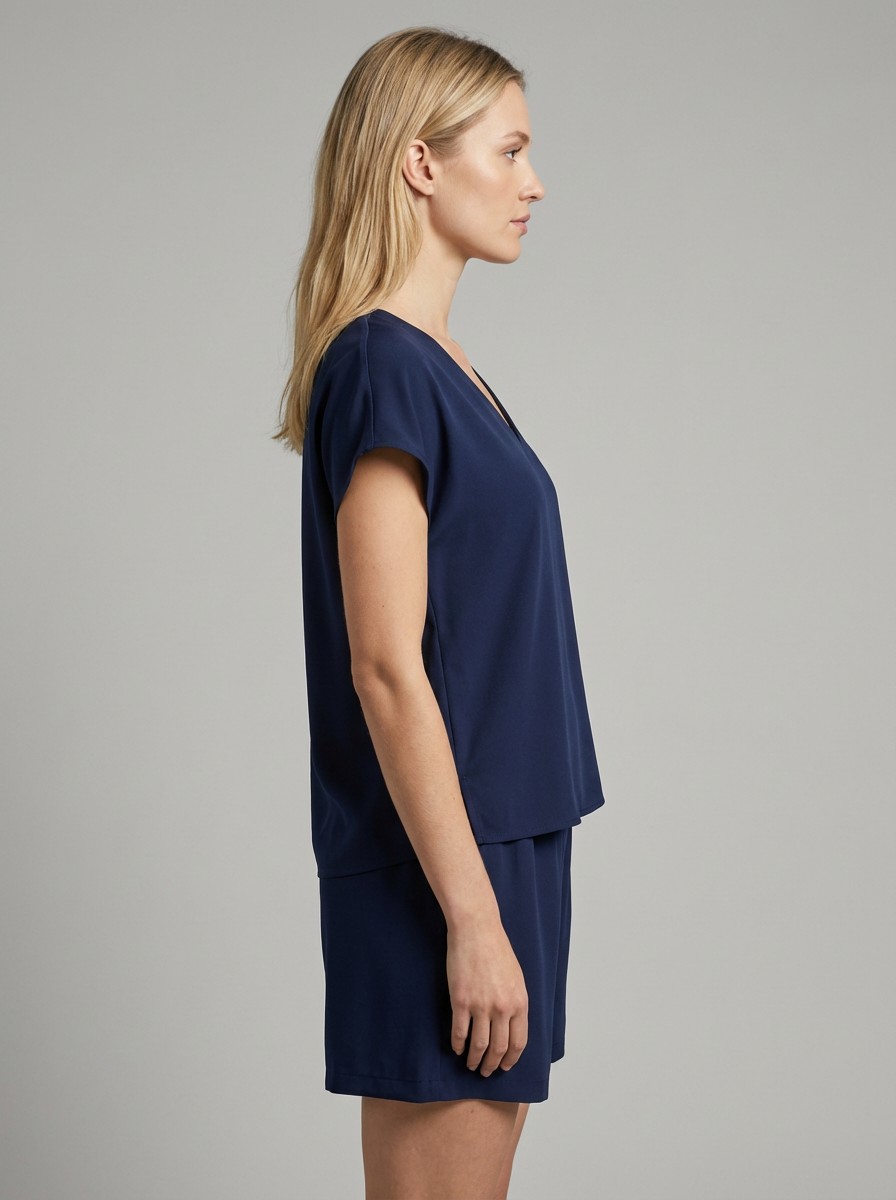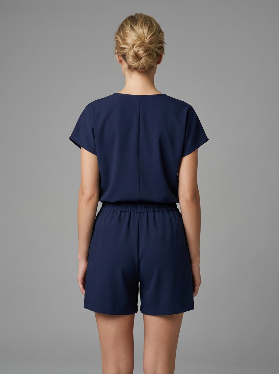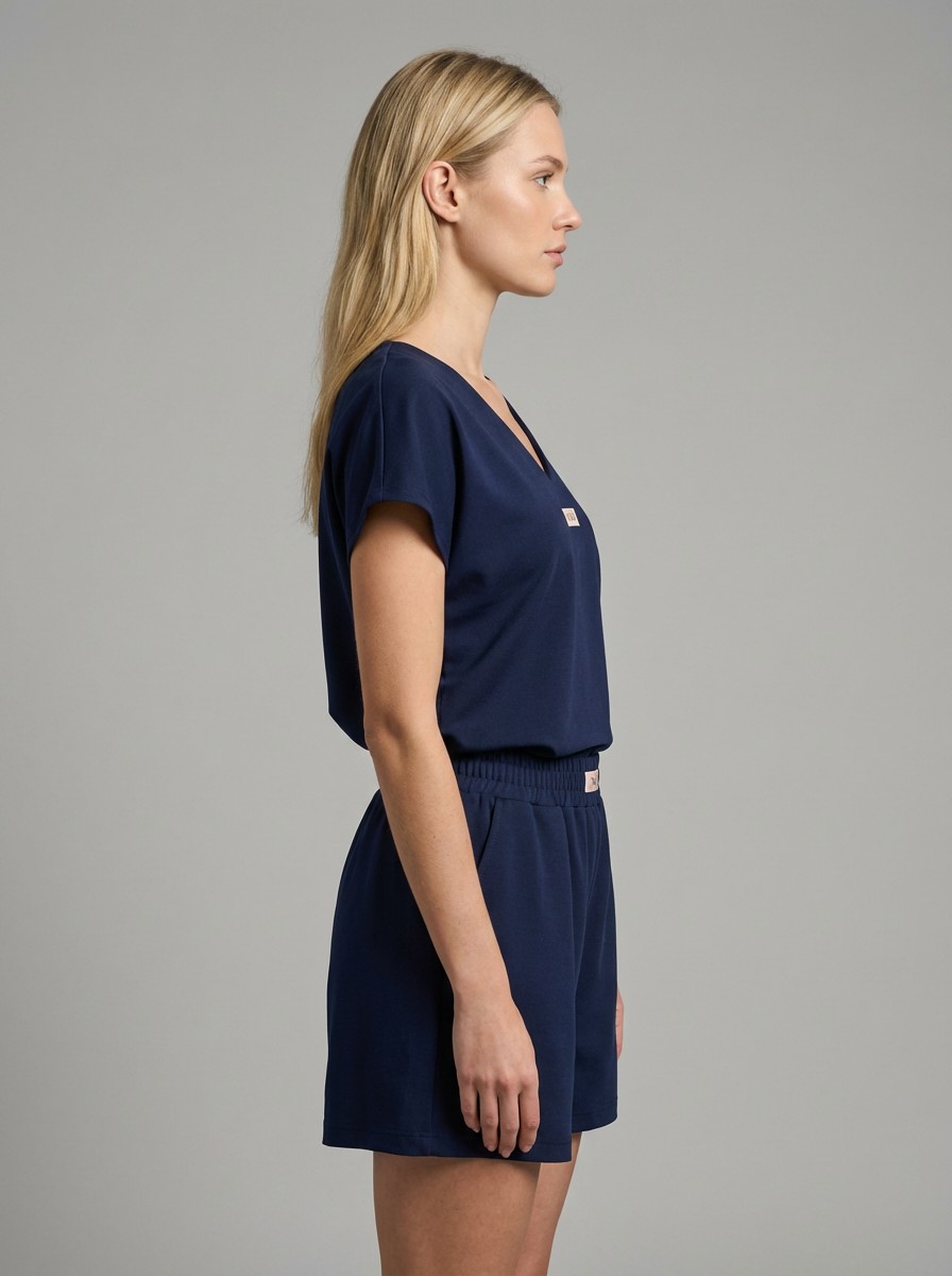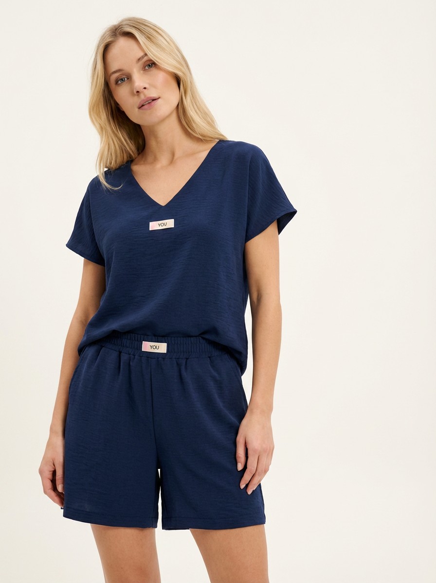 Ανάλαφρο και κομψό σετ σε υπέροχη μπλε απόχρωση, ιδανικό για τις καθημερινές αλλά και πιο chic εμφανίσεις σου. Το T-shirt διαθέτει χαλαρή γραμμή με V λαιμόκοψη, προσφέροντας άνεση και στυλ, ενώ η βερμούδα με λάστιχο στη μέση αγκαλιάζει όμορφα το σώμα και χαρίζει ελευθερία κινήσεων.