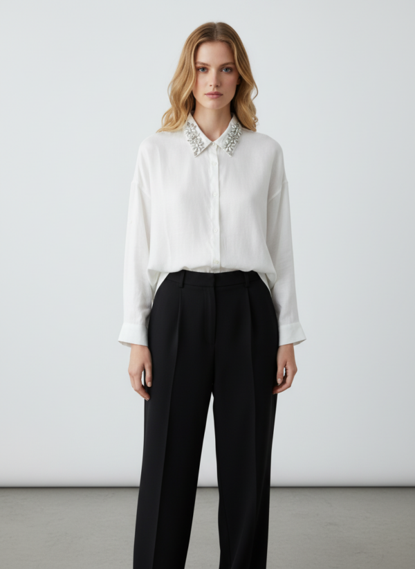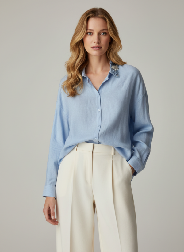 Ολη η ιταλική φινέτσα πάνω στο συγκεκριμένο πουκάμισο .Μπορεις να το φορέσεις όλο τον χρόνο .Τα ιδιαίτερα κεντημένα στρας στον γιακά είναι αυτά που το κάνουν πιο ξεχωριστο .Αποπνέει φρεσκάδα και θηλυκότητα.